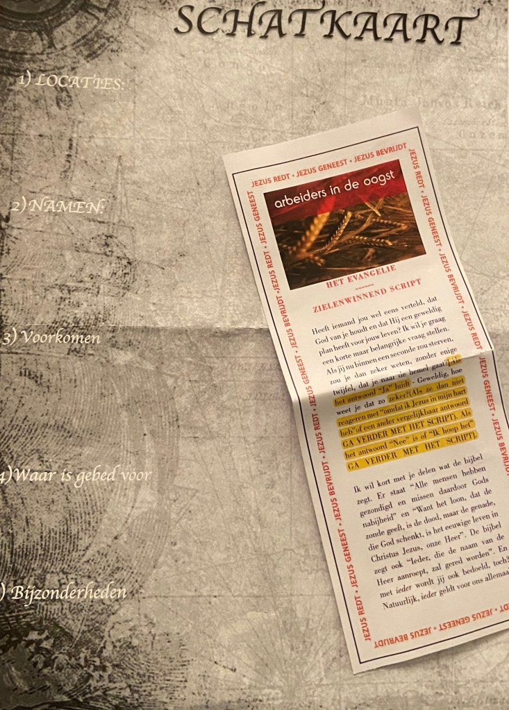 We vragen de schatkaart aan de Heilige Geest, met andere woorden, Hij geeft ons, als we stil zijn voor God, de aanwijzingen, die we nodig hebben om de schatten, de verloren zielen te vinden. achteraf zijn ze soms super accuraat, maar wanneer je ze ontvangt, dat noemen we ‘woorden van kennis’ lijkt het soms nog een raadsel. Maar weet, Hij helpt je, Hij houdt ze niet voor ons verborgen, maar van ons verborgen! En Hij wil nog liever dan wij dat we ze vinden!